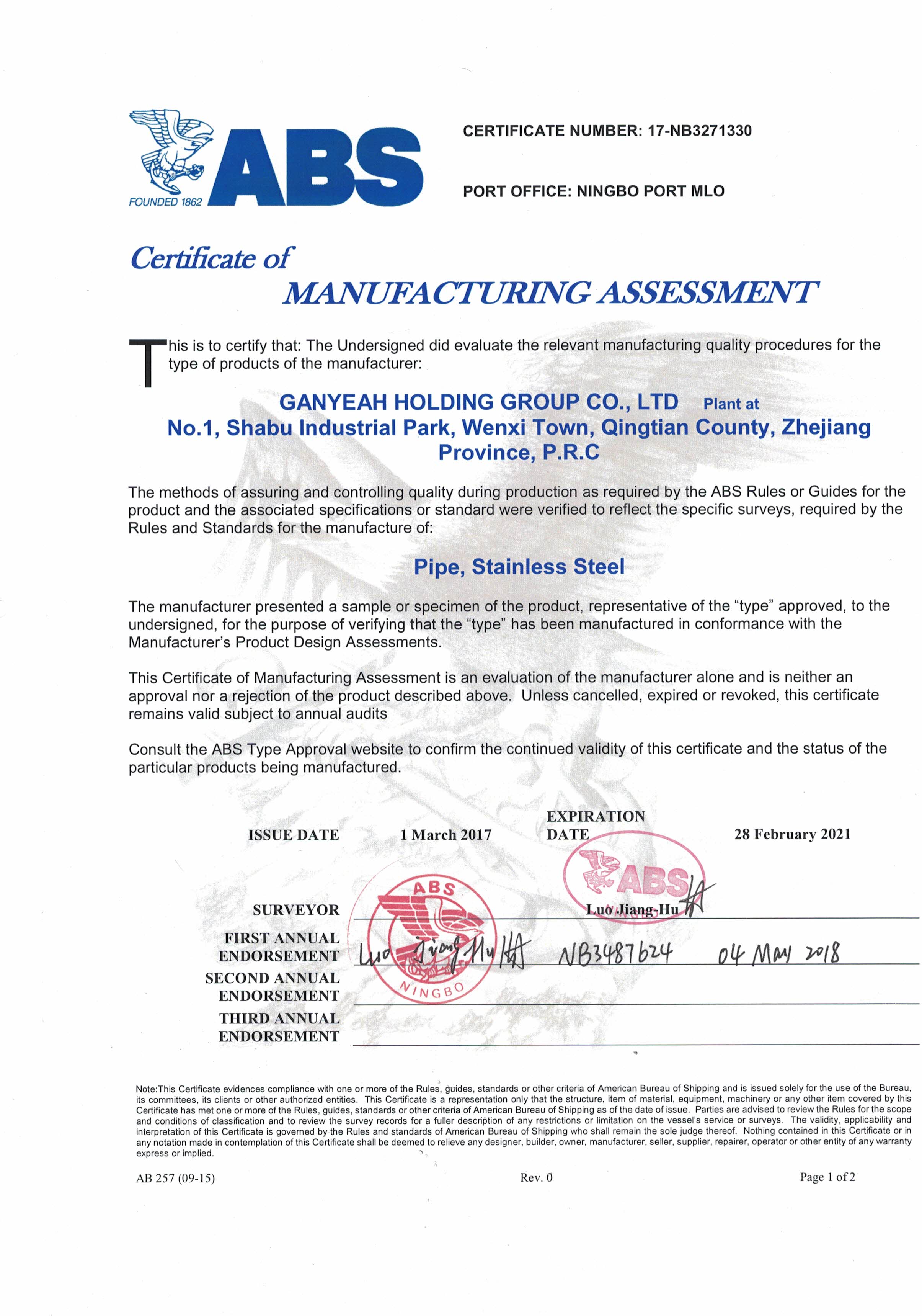 美國船級(ji)社工廠認可證(zheng)書(MA)